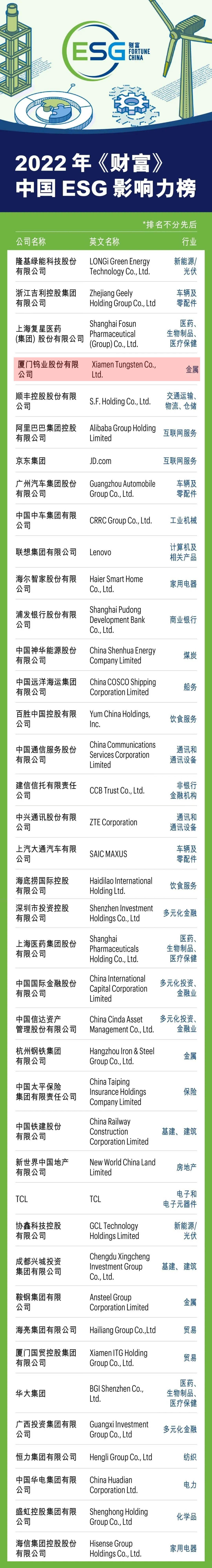 近日,,《财富》发布首份中国ESG影响力榜,,有40家在改善环境、、、保护员工、、、支持社区上做出了卓越努力的中国企业上榜,,,,厦门钨业成功入选。。